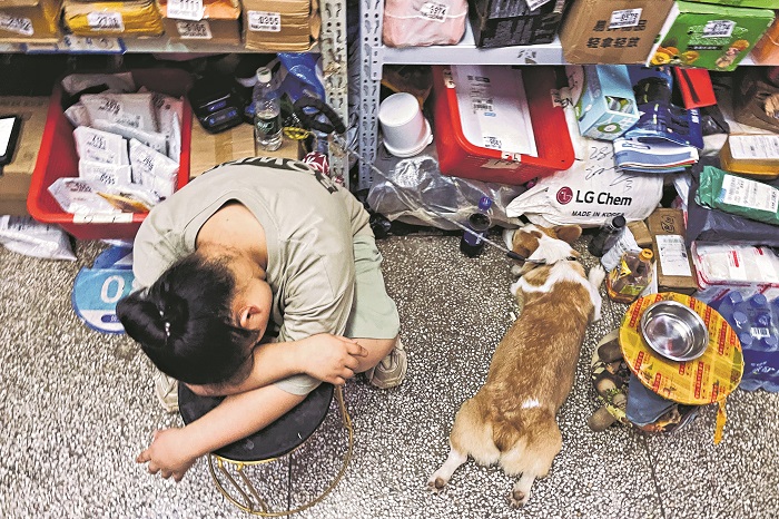2024年8月30日,江苏南京鼓楼区一菜鸟驿站内,工作人员和她的小狗一起午休。本报记者 刘金梦 摄