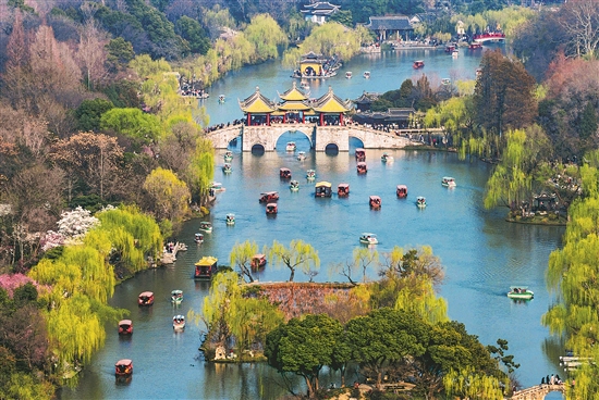 3月15日,游客在江苏扬州瘦西湖风景区游玩。春满山河,人间正暖。新华社发(周社根 摄)