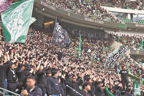 图为北京国安队球迷为球员呐喊助威。