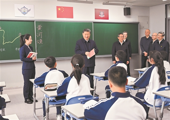北京市援建的北京四中雄安校区2023年8月投入使用,现有学生380多人。教学楼里,学生们正在上课。习近平走进初一(2)班教室,同师生交谈,了解教学情况。他希望把北京四中办学的好经验好做法带过来,用心用情呵护孩子们身心健康,促进孩子们全面发展。