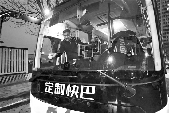 3月16日清晨,定制快巴在北京草桥发车前,司机擦拭前挡玻璃。当日起,为进一步落实京津冀协同发展战略,织密京雄两地交通网络,经过一年多试运营,京津冀定制快巴北京至雄安新区通勤线路正式开通运营。