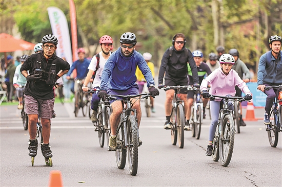 为推广绿色出行和健康生活理念,智利首都圣地亚哥市区的多条街道在每周日9时至14时对机动车封闭,方便人们进行骑行、跑步等活动。图为近日,在智利圣地亚哥,人们在“无车日”骑车出行。