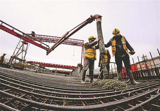 3月26日,工人在沪宁合高铁沪宁段宝慧制梁场1000榀箱梁浇筑施工现场进行混凝土浇筑作业。