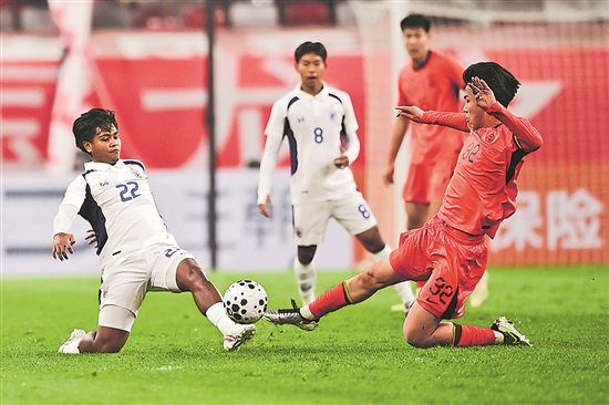 3月25日,在陕西西安举行的2026CFA中国之队·“丝路欢乐世界”西安国际青年足球锦标赛首轮比赛中,中国U23队2比2战平泰国U23队。图为中国队球员王博豪(前右)在比赛中与泰国队球员森沙瓦拼抢。
