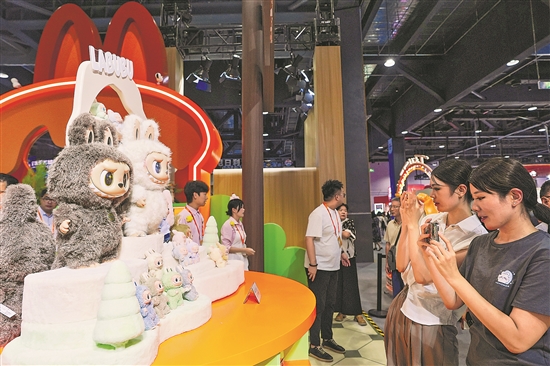 图为在2025服贸会泡泡玛特展位,参观者拍摄LABUBU玩偶。