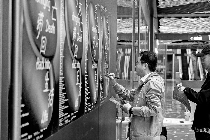 “将死亡带回生活”艺术展成都站开幕仪式上,嘉宾入场签名。