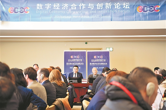 图为近日在瑞士日内瓦万国宫,人们参加2026全球数字经济大会数字经济合作与创新论坛。