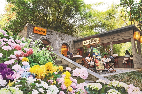 3月24日,游客在深圳国际园林花卉博览园内的茶室休息。
