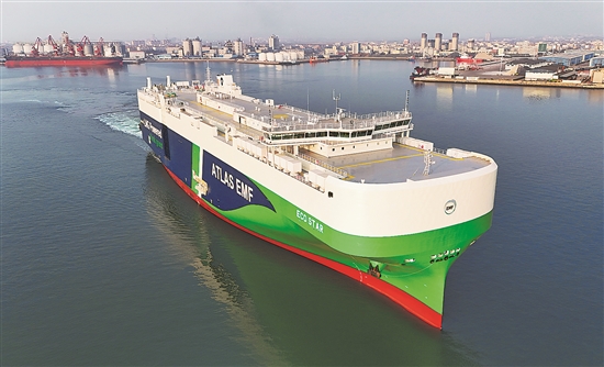 4月2日,7000车位双燃料汽车运输船“洁能之星”轮在山东港口烟台港龙口港区投入运营。该船配备液化天然气(LNG)动力系统,同时采用“氨预留”设计,可在升级改装后使用清洁的氨燃料。新华社发(唐克 摄)