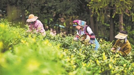 4月2日,茶农在六盘水市六枝特区月亮河彝族布依族苗族乡的茶山采摘春茶。