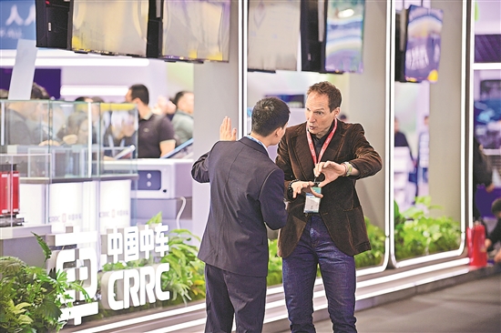 4月2日,参观者(右)在第十四届储能国际峰会暨展览会上了解中国中车的储能产品。