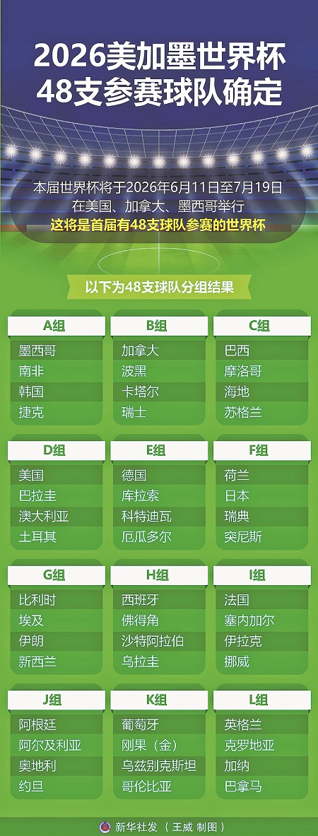北京时间4月1日,2026年美加墨世界杯欧洲区附加赛和洲际附加赛相继结束。随着波黑队、捷克队、瑞典队和土耳其队战胜各自对手,刚果(金)队1比0战胜牙买加队,以及伊拉克队2比1力克玻利维亚队,本届世界杯48支正赛球队已全部确定。当地时间6月11日,本届世界杯将在墨西哥城阿兹特克球场拉开战幕。