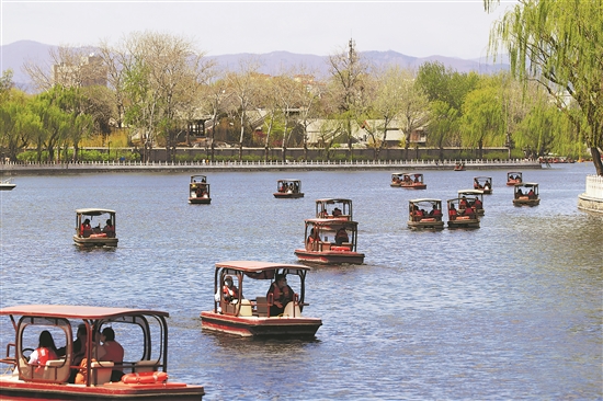 4月6日,清明节假期最后一天,游人在北京什刹海风景区游览。