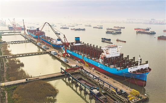 4月6日,江苏省泰州市江苏新扬子造船有限公司厂区,多艘船舶开工建造中。