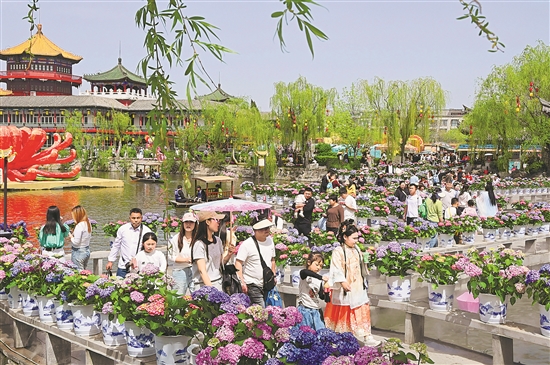 4月5日,游客在河南省开封市翰园碑林游览玩耍。