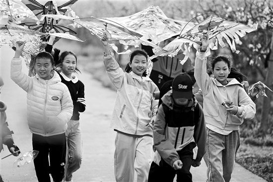 4月4日,江苏南通海安市大公镇于坝村,千亩梨花盛放。大公镇中心小学的学生和家长漫步梨园,放风筝、玩滑板,在春日花海中嬉戏游玩,乐享惬意春假。