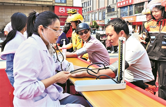 4月9日,江西抚州金溪县,当地持续深化“暖新”行动,医务工作者、理发师、推拿按摩师等志愿者为快递员、外卖员、网约车司机等新就业群体提供免费健康体检、理发和推拿按摩等服务,全方位关心关爱新就业群体,切实增强其归属感、幸福感和获得感。视觉中国 供图