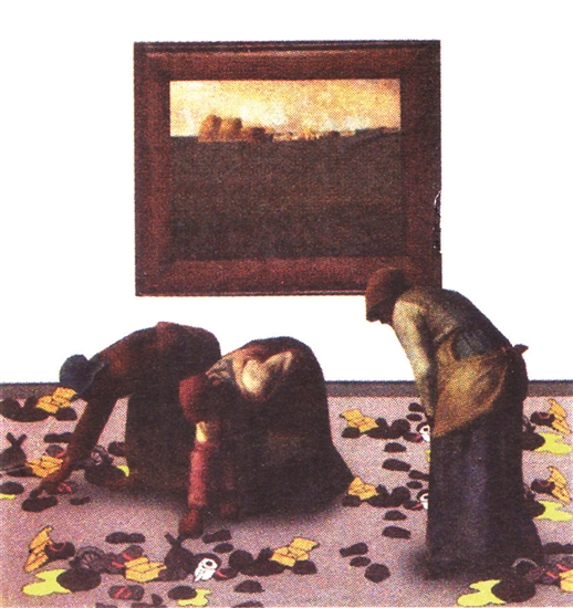 法国画家米勒的名画《拾穗者》描绘了农人秋收拾麦穗的愉悦。这幅漫画作者却让拾穗者走出画框,拾旅游者随地丢弃的垃圾,真是绝妙讽刺!