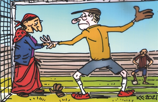 绿茵场上,你争我夺的拼抢甚是扣人心弦。恰在此时,守门员遇上最怵头的点球,“急来抱佛脚”,他请来巫师预卜吉凶——可笑、可悲!