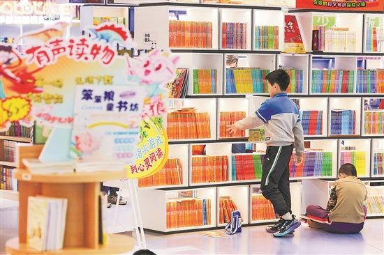 4月12日,小朋友在河北省石家庄书城选看儿童书籍。