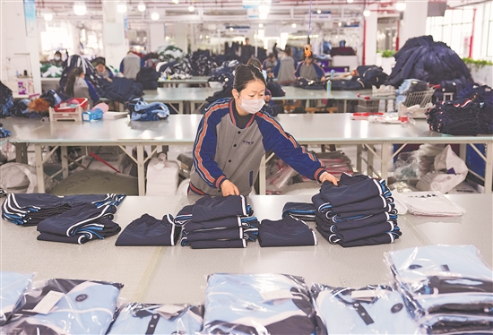 4月13日,织里镇一家童装企业的员工在车间内整理即将打包的校服产品。2025年,织里童装产业校(园)服、运动服等细分市场竞争力强劲,其中校(园)服全年销售额达120亿元。