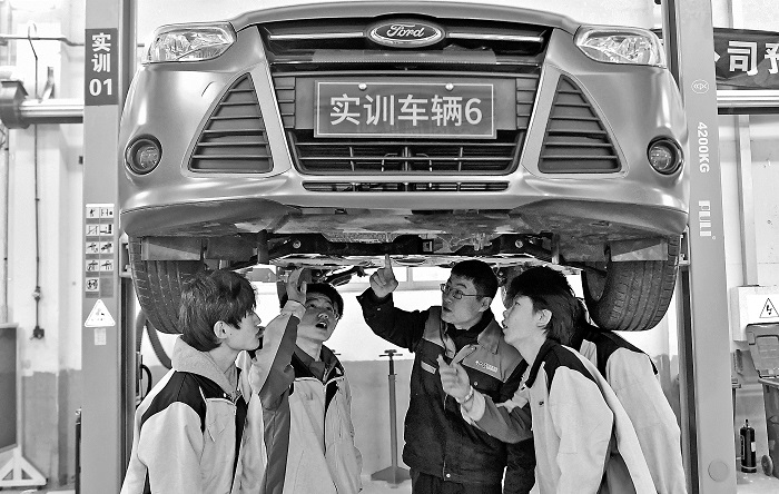 2024年11月18日,在山东省临沂市一所技师学院,学生在老师的带领下进行汽车组装技术实训。视觉中国供图