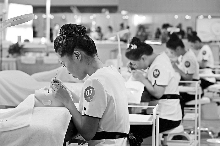 2023年9月17日,第二届全国技能大赛在天津举行,选手们在美容项目竞赛中。本报记者 吴凡 摄