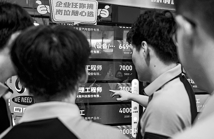 2024年5月30日,广东省广州市一所技师学院内举办技能人才双选会,学生们在查看招聘信息。视觉中国供图