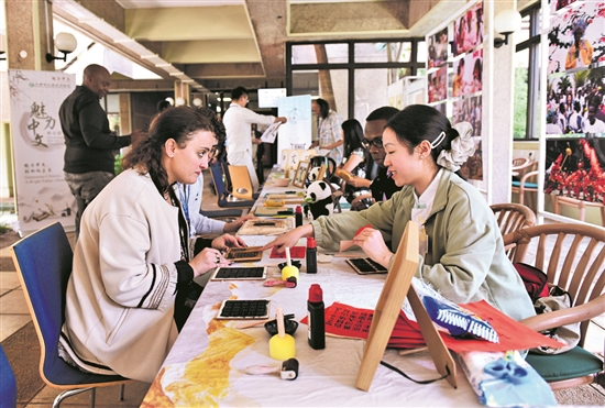 为庆祝第17个联合国中文日,以“字载千秋 文脉同辉”为主题的中文日和文化体验活动,于当地时间4月13日在联合国内罗毕办事处举行。图为人们在联合国中文日文化体验活动现场体验书法拓印。新华社记者 刘琼 摄