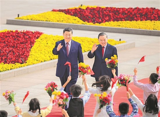 双方要同心协力,携手同行现代化道路。要加快发展战略对接,优先推进基础设施互联互通。要加强人工智能、半导体、物联网等新兴领域合作。中方欢迎更多越南优质产品进入中国市场。双方要继续加强旅游、文化、媒体、教育、卫生、体育等友好交流合作,促进两国人民相知相亲。我愿同你一道宣布启动2026-2027年“中越旅游合作年”。