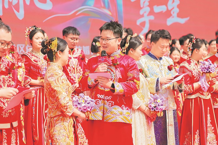 4月12日,正值泡桐花浪漫绽放之际,以“AI享一生”为主题的北京经开区职工集体婚礼、北汽新能源第五届青年集体婚礼在博大公园举办。28对新人身着中式婚服携手登场,在烂漫花海中许下爱的誓言。本报记者 赖志凯 本报通讯员 何欣 摄