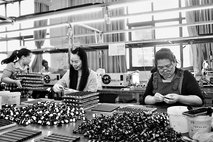 4月10日,湖南省怀化市通道侗族自治县产业开发区锶鑫电子有限公司内,工人们在流水线上有序作业。该企业推行“总部+乡村车间”模式,将生产车间延伸至乡镇村寨,开发灵活就业岗位,让群众在家门口实现稳定增收,目前已吸纳600余人在家门口就近就业。本报通讯员 李尚引 摄