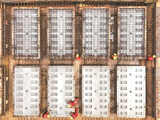 4月17日,在四川省资阳市安岳县成渝中线高铁安岳制板厂,工人进行混凝土轨道板施工作业。