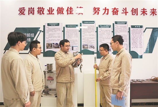 近日,国网江苏邳州供电公司工会组织变电运维班组开展创新成果分享活动,通过以老带新、以技传技,激发青年职工的钻研和创新热情,助力电网安全稳定运行。图为该公司变电运检中心变电运维班组青年骨干刘雪璨为青年职工讲解便携分离式接地装置在实际工作中的应用技巧。