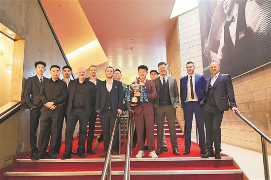 近日,2026世界斯诺克锦标赛媒体日活动在英国谢菲尔德克鲁斯堡剧院举行。本次世锦赛于4月18日至5月4日在英国谢菲尔德举行。图为卫冕冠军中国选手赵心童(前排右四)、中国选手丁俊晖(前排左二)和其他参赛选手出席媒体日活动。新华社发 (翟政 摄)