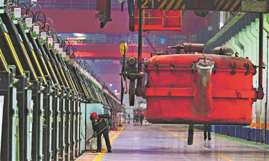 4月15日,广西华磊新材料有限公司电解铝厂电解一车间内,巨型红色抬包凌空吊运,滚烫铝水在包内翻涌。班组员工称它为红色“巨人”——铝水直供的生命线,从这里启程。运行乙班职工李津林正俯身修整出铝口,红色滚烫的电解质液和跳跃的火苗,映红了整个作业面。蓝绍祯 摄