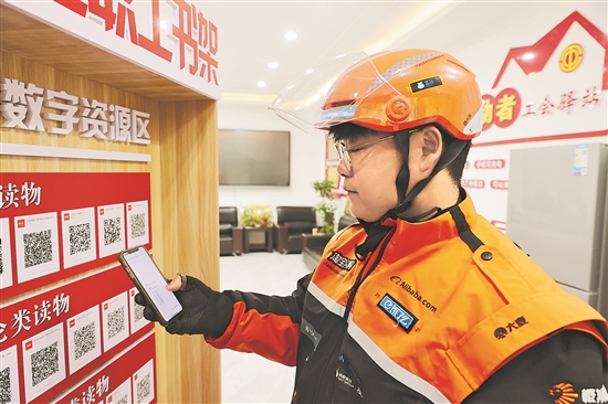 4月21日,一名骑手小哥在安徽省淮北市相山区职工服务中心工会驿站书吧内扫码阅读。