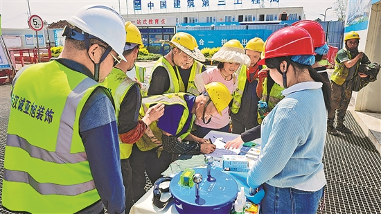 “五一”前夕,四川邛崃市人社局组织工伤预防小分队走进该市高铁片区建设工地,进行安全宣传。活动将传统的安全宣讲升级为沉浸式体验课,借助触电体验仪、醉酒模拟眼镜和心肺复苏模拟人等设备,以互动“可感知、可操作”的方式,让安全意识走进建设者心里。本报通讯员 雷悦 摄