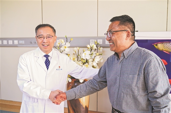 日前,黑龙江省哈尔滨医科大学附属第二医院举办第22届“4·26爱心日”大型义诊活动。亚洲心脏移植术后存活纪录保持者、术后32年的“换心人”于文峰(右)也来到现场与该院心血管病医院院长、心内科主任于波交流。据悉,于文峰于1994年2月在该院接受心脏移植手术。 赵宇航 摄/视觉中国