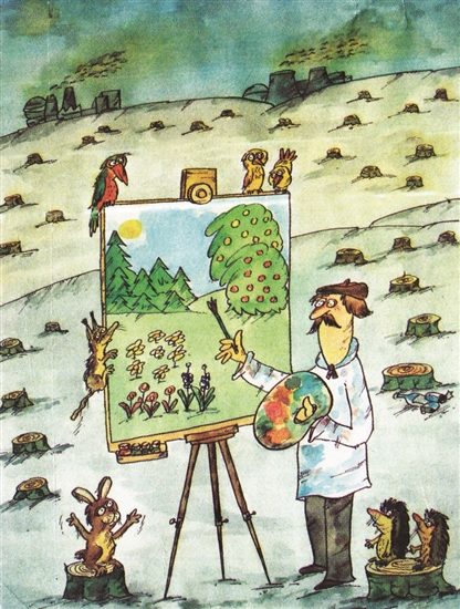 这里曾是青山绿水一片,珍禽奇兽嬉戏的“仙境”。战乱与人祸,让这一切都化为乌有,画家在灰蒙蒙的天地中靠画笔回忆当年……