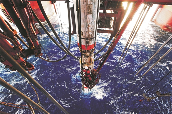 我国海洋石油981平台钻井工人安装水下防喷器控制电缆卡子。赵亮 摄