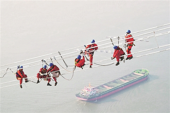施工人员在1000千伏特高压螺山长江大跨越高空作业。徐可 摄