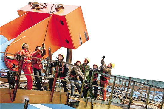 我国海洋石油981平台钻井工人安装水下防喷器控制电缆卡子。赵亮 摄