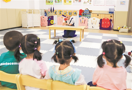 近日,在深圳市龙岗区平湖街道良安田社区党群服务中心设立的免费托育点,老师通过龙岗特色的“龙宝小剧场”为宝宝表演绘本故事。