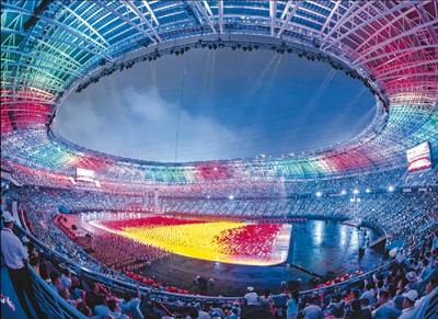 在文艺展演的最后,金红的第十三届全运会会徽在整块场地面前盛大铺陈,天津的沃土中即将生长出崭新的竞技希望,海河的欢歌里即将传唱着跃动的拼搏传奇。全运会是国内练兵的主赛场,是选拔和培养奥运人才的重要渠道和舞台。在2020年东京奥运会新周期,新一批高水平竞技体育人才将从海河之滨走出……