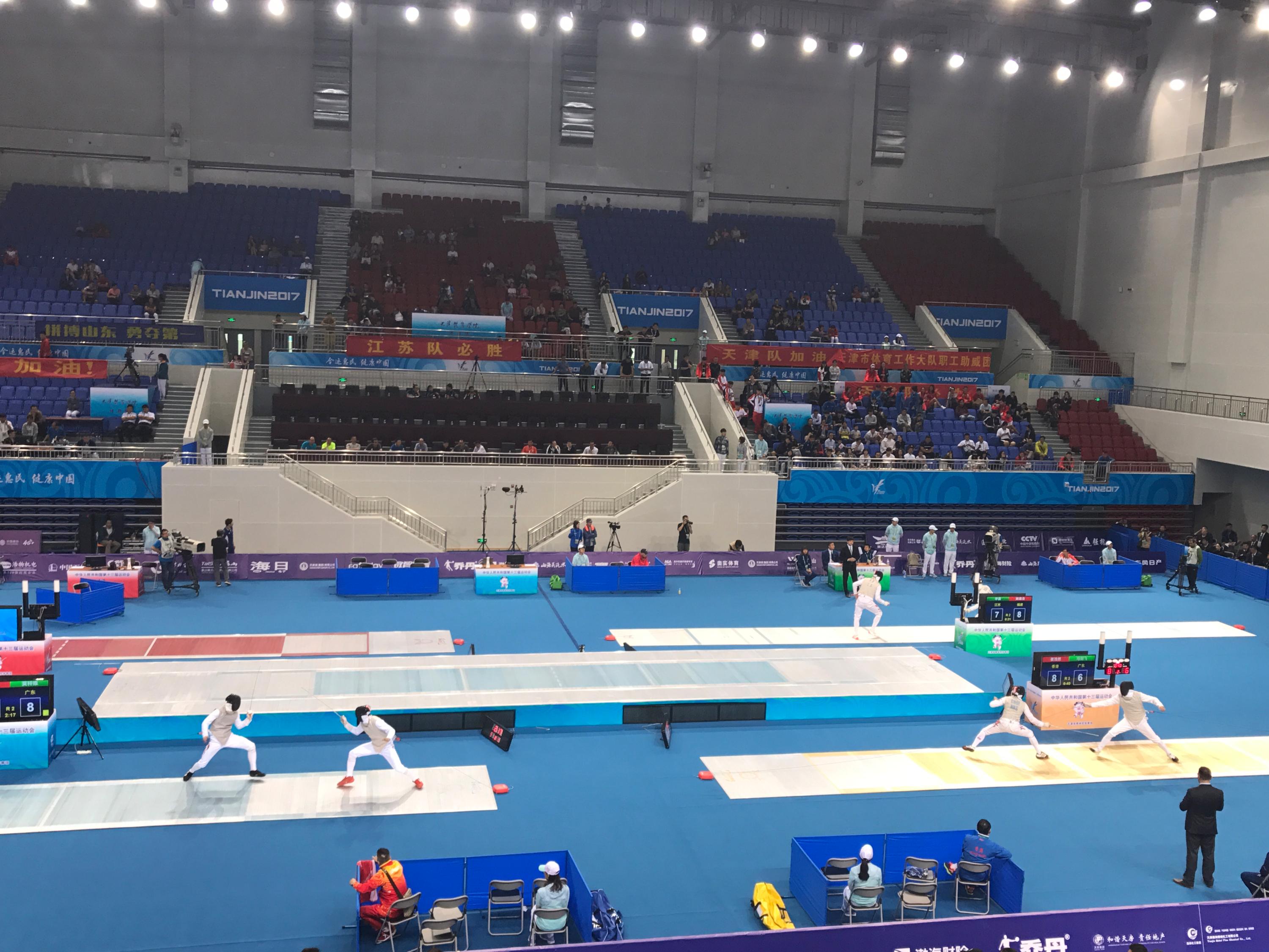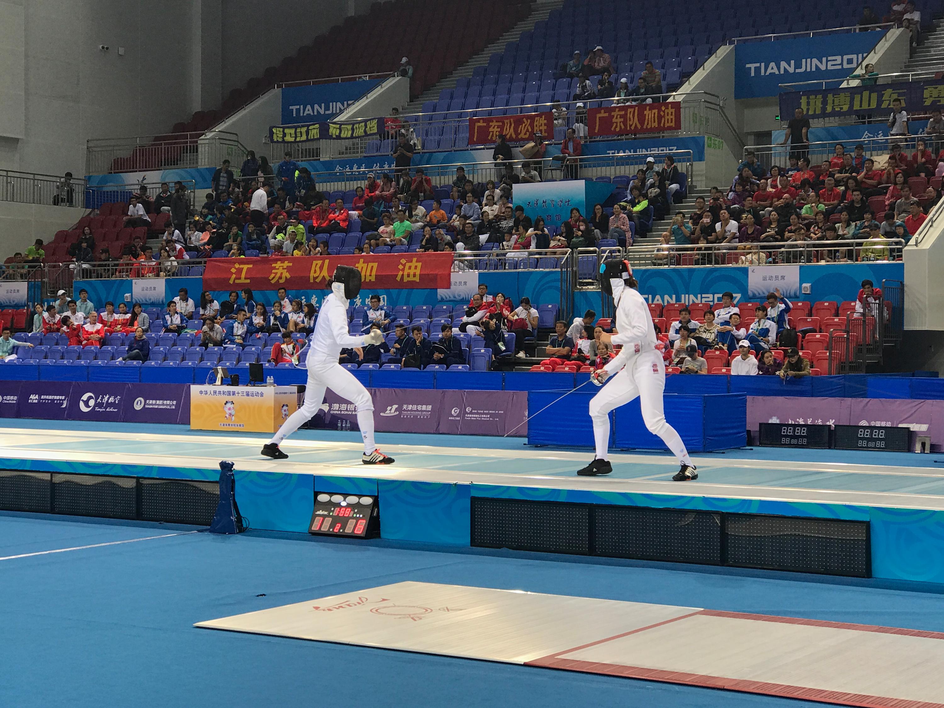 今天是全运会击剑比赛的第三天,也是我第三次亲临现场观看击剑比赛。在这之前,我对于击剑的印象,不过就是双方拿着剑,在决赛高台上你攻我防,我进你退。可真正身临其境才知道,原来击剑看似只是剑与剑间的摩擦,实则还有身体与意志力的较量、粉丝与粉丝间的比拼。