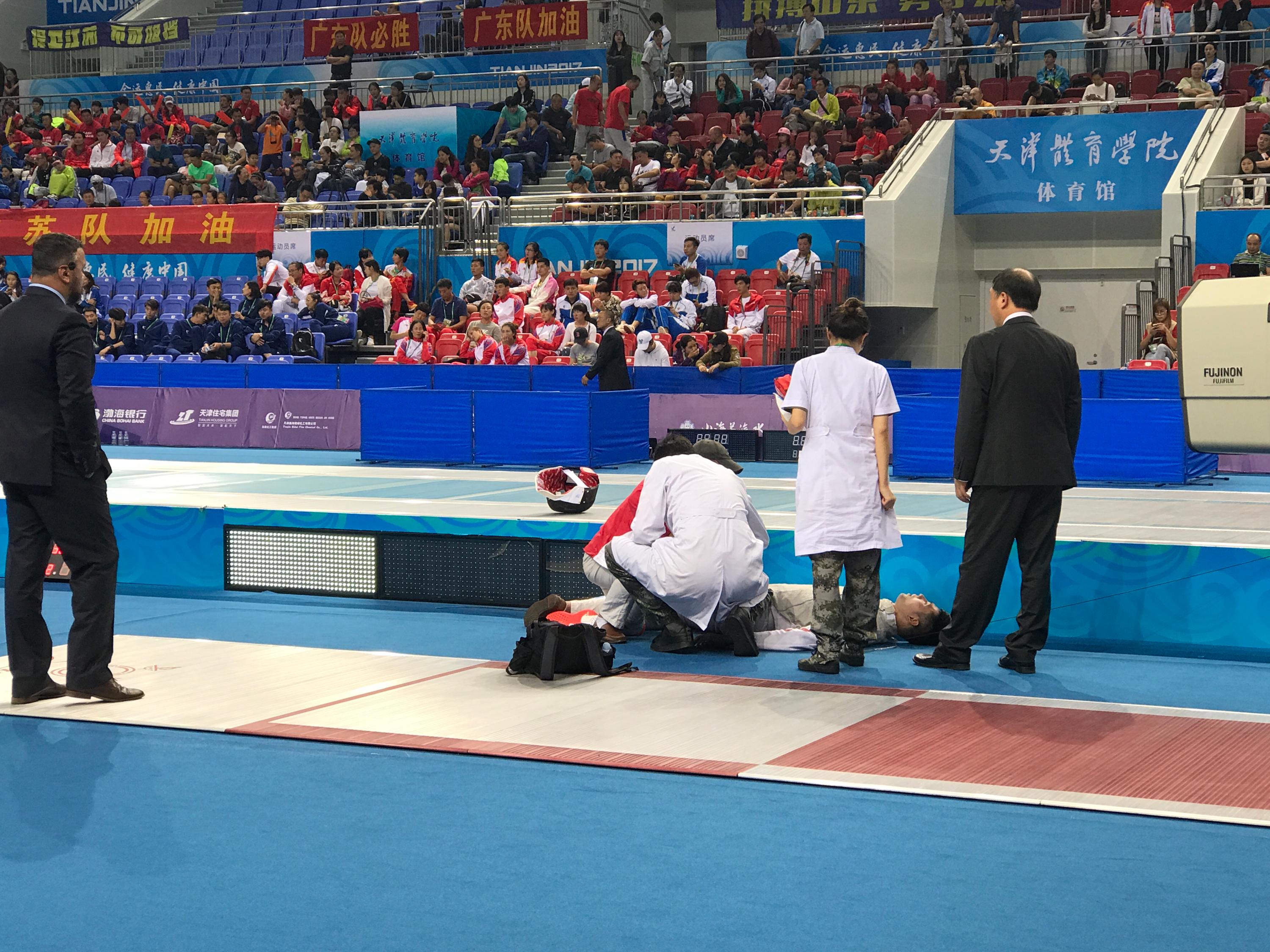 击剑比赛从早上9点一直比到晚上8点多,如此长时间高强度的比赛,让冲击到最后阶段的选手也耗尽了所有力气。在8月29日的男子花剑个人赛上,福建队陈海威和江苏队李晨就在赛中出现了抽筋等身体不适的表现,不得不中断比赛,接受医护人员的紧急处理。看到陈海威和李晨躺在地上,我的心也揪了起来。可越是到了最后时刻,就越没有人愿意放弃,何况李晨离铜牌只有一步之遥,教练在一旁冲他一直大喊:“拼了啊。”李晨最后勉强站起来,艰难打下了这枚铜牌。赛后他说:“当时抽筋动不了,不过还是想把比赛耗住,等到缓过来再把比分赶上来,还是想拼一下。”