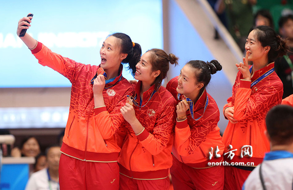 天津北方网讯:2017年8月28日,第十三届天津全运会女排成年组比赛在天津人民体育馆圆满收官。在决赛中,江苏队直落三局以3-0的比分击败上海队,首次获得全运会冠军。颁奖仪式上,江苏女排的姑娘与主教练蔡斌一同登上了最高领奖台,在粉丝的欢呼声中,共享这荣誉时刻。
