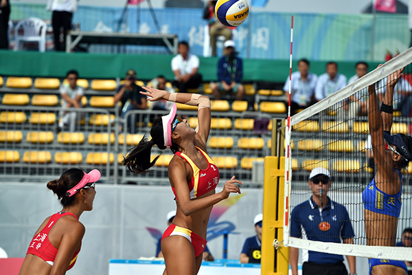 天津北方网讯:8月29日,第十三届全运会沙滩排球比赛在天津东疆湾景区继续进行。在上午9点开始的沙滩排球女子组的第二场比赛中,来自东道主天津的组合刘萍/左子凡对阵上海组合王静/瞿彬弘。结果,由于实力上的差距,天津队以总比分0-2(11-21/10-21)不敌上海队。第一局,天津队先拔头筹,随后双方比分交替上升,上海队利用身高优势对天津队保持压力,不过效果并不明显,比分来到9-9。随后,上海队利用自己的大力扣球连续得三分,比分来到9-12。比赛进入短暂休息,休息过后,上海队利用天津队的失误将分差拉开。比分来到9-16,天津请求暂停,暂停回来,上海队王静的发球帮助上海队拿到局点,第一局末,王静的大力扣杀帮助上海队以21-11拿下第一局。