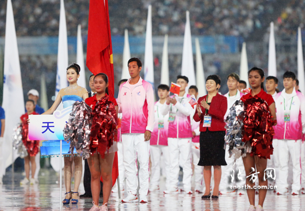 在开幕式拉开帷幕的那一刻,几百名天津体育学院的美丽女孩手持彩球,站立在体育场周围。在运动员入场式接近一个小时的时间里,姑娘们没有丝毫懈怠,用饱满的激情迎接全运会各个代表团的入场。
